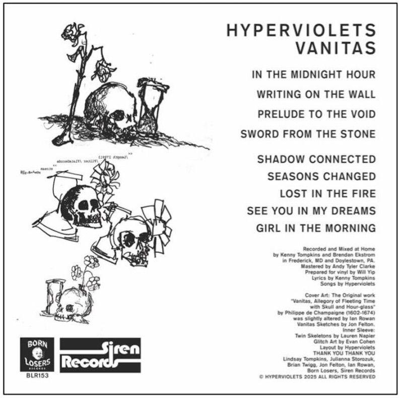 VANITAS is the debut album from Hyperviolets. The title is taken from the name of a genre of paintings, prominent in 17th-century art, that serves as a reminder of the futility of earthly pleasures and the inevitability of death. The duo worked with this concept in mind, using death as a common starting point for the subject matter throughout and examining it through a different lens for each track. It is not meant to be a macarbe or morbid fixation but rather an embrace of truth, looking at death with a spirit of willingness and acceptance.